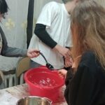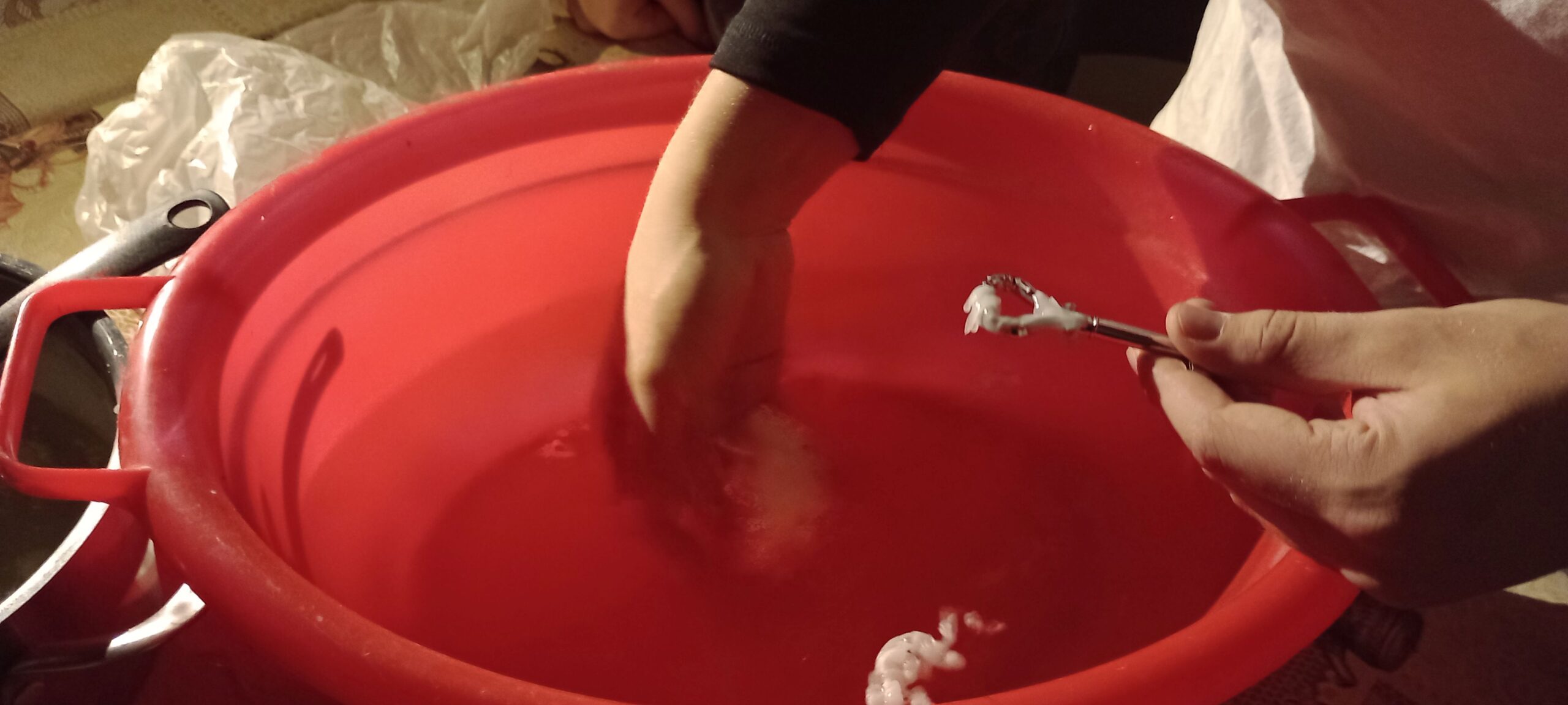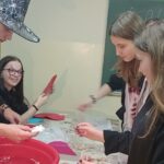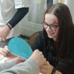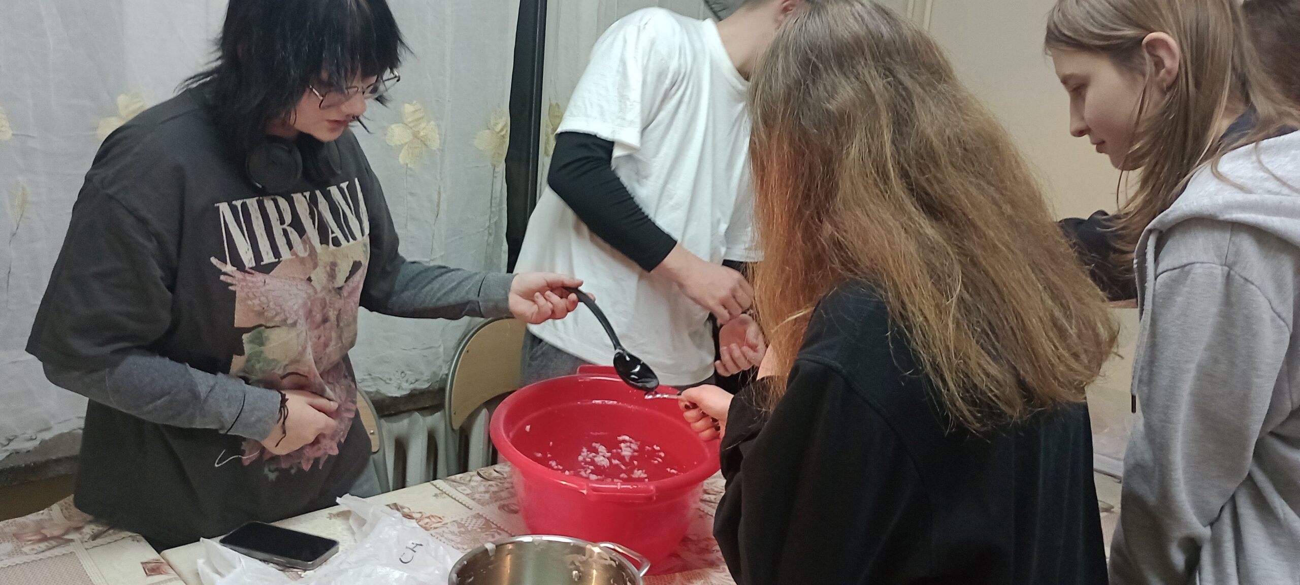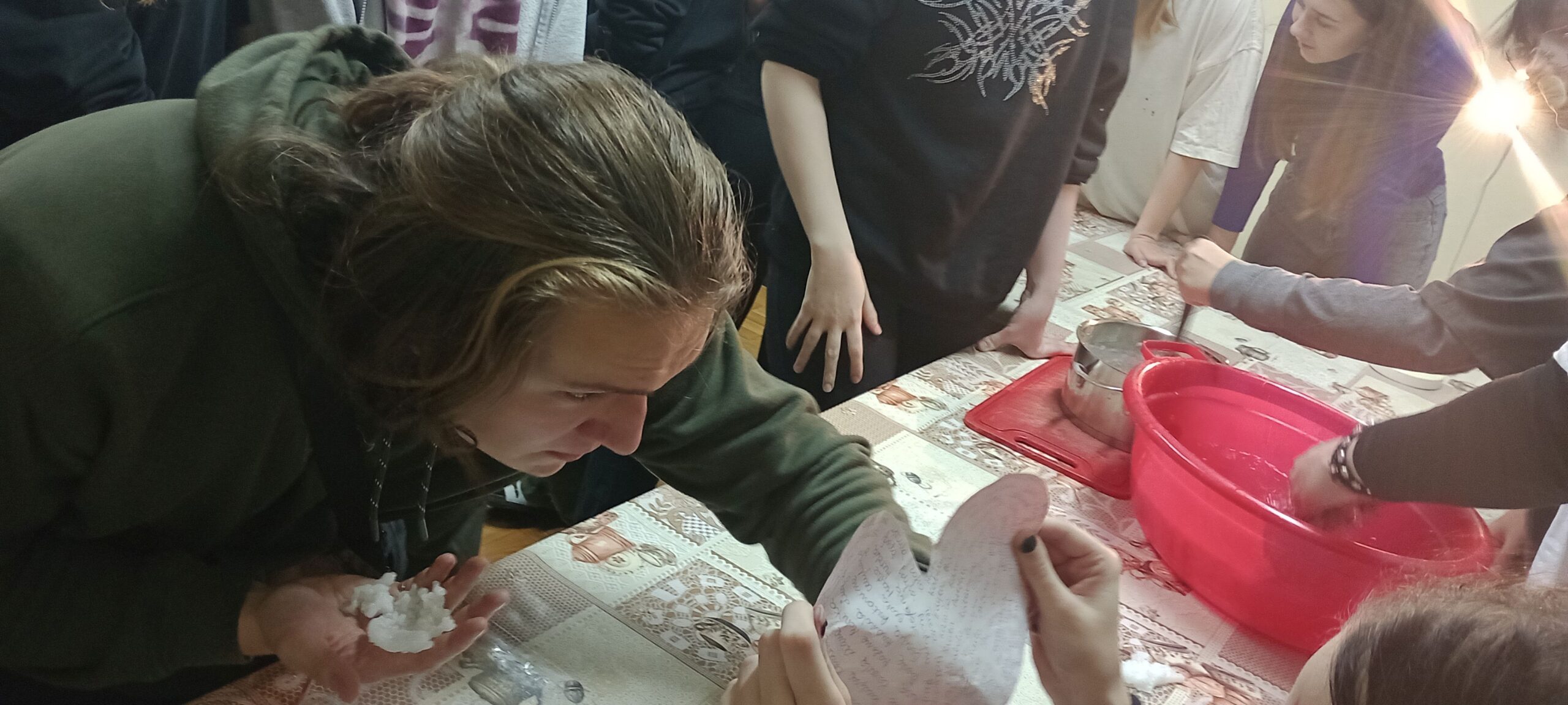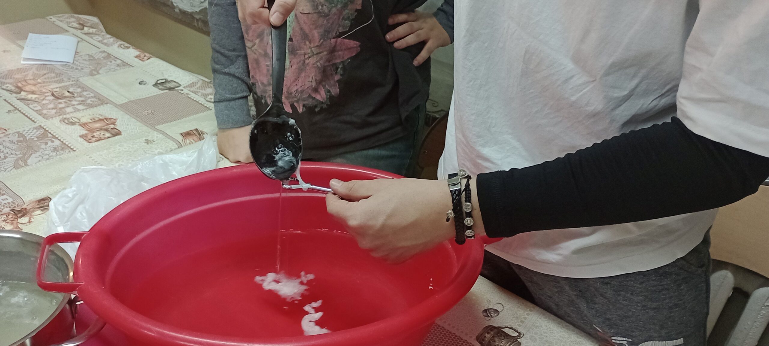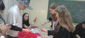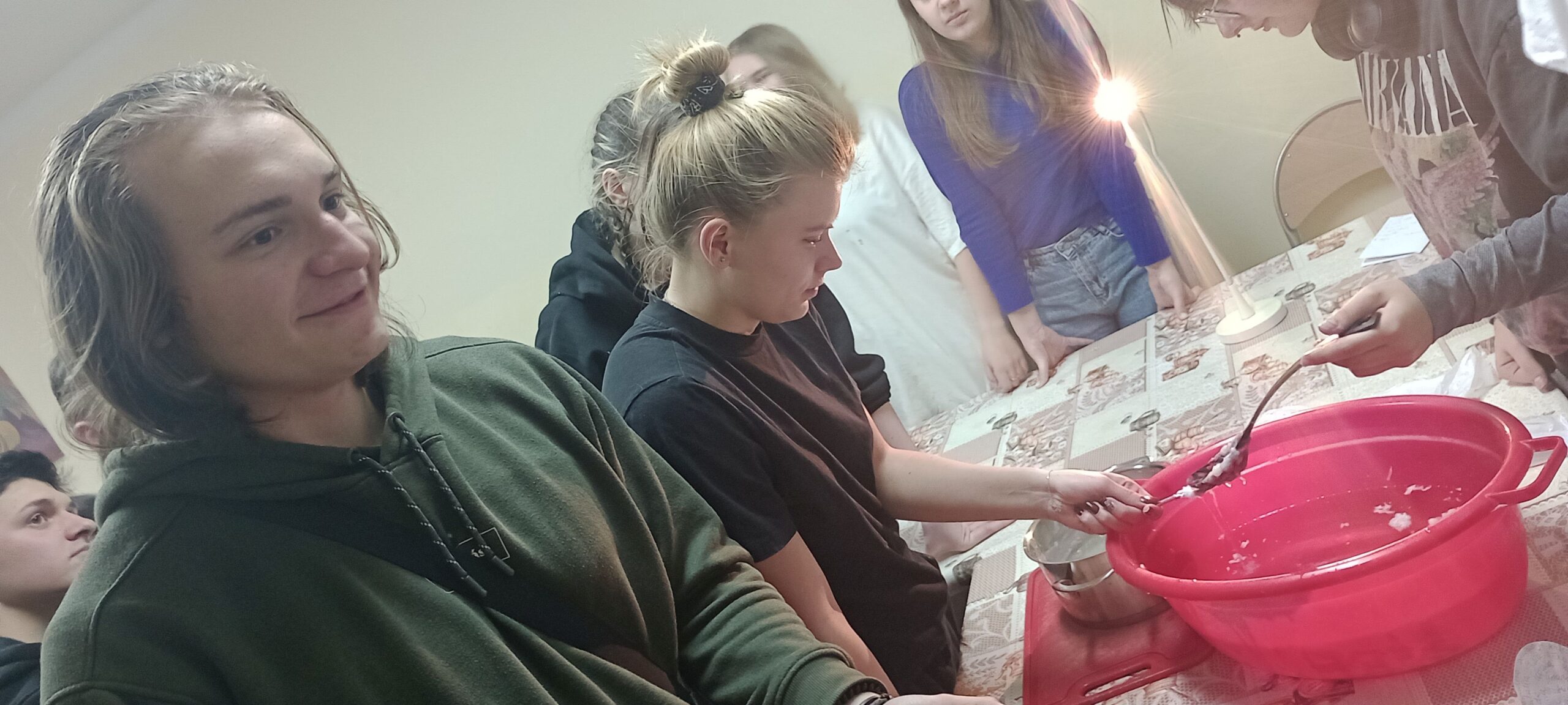 W ostatnich dniach listopada 2023 r. odbyły się kolejne zajęcia integrujące młodzież polsko- ukraińską w naszej Bursie. Nie mogło więc zabraknąć tradycyjnego lania wosku przez dziurkę od klucza, przekłuwania serc z imionami wybranków czy losowania przyszłych zawodów. Szybkie zamążpójście wywróżyła sobie Anastasiia, której but jako pierwszy przekroczył próg pokoju.